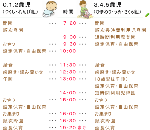 ご家庭と保育園が連絡をとりあい、その日の体調や状況に応じて個別に対処していきます。特に乳児や1歳半までの子どもさんにつきましては未熟で個人差もあり、病気に対する抵抗力も弱いので一人ひとりの生活(ミルク・離乳食・昼寝・排泄・遊び)を十分に考慮して保育していきます。新入園児の場合は、ご家庭での生活から少しずつ友だちと楽しみながら保育園の生活リズムに慣れることができるようにしていきます。